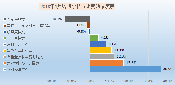 (二)28个行业大类出厂价格同比“18升7降3平”。1月份涨幅排在前5位的行业有:造纸和纸制品业、黑色金属冶炼和压延加工业、化学原料和化学制品制造业、专用设备制造业,分别上涨36.3%、19.5%、18.4%、15.6%和8.9%,共同拉动总指数上行2.7个百分点。